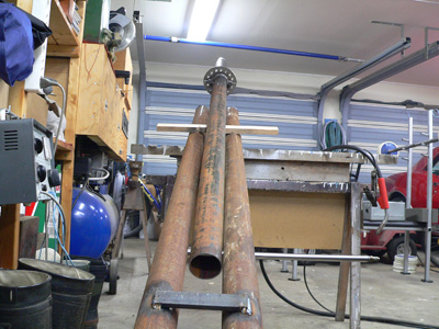 Vertikalantenn för 80 meter - Mastfot modell julgransfot, SA6AMV håller i målarpenseln.
